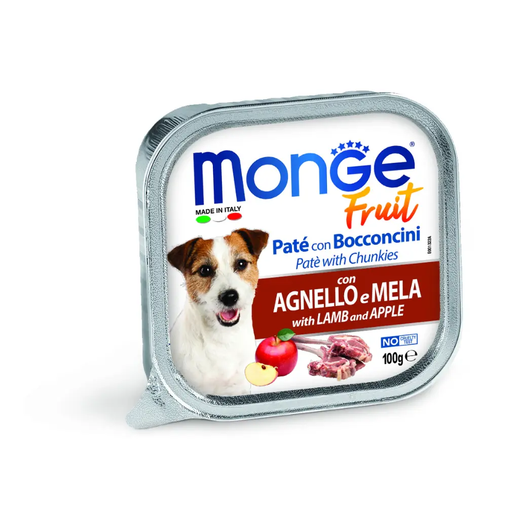 Complete and digestible food studied for the balanced diet of adult dogs. Soft and tasty paté and chunkies with lamb and apple, it has a firm texture and a pleasant aroma. Delicious paté with a centre of delectable chunks with meat and fruit to give your four-legged friends the daily well-being they need. Monge Fruit is free of colourants and preservatives and is currently available only in foreign markets.