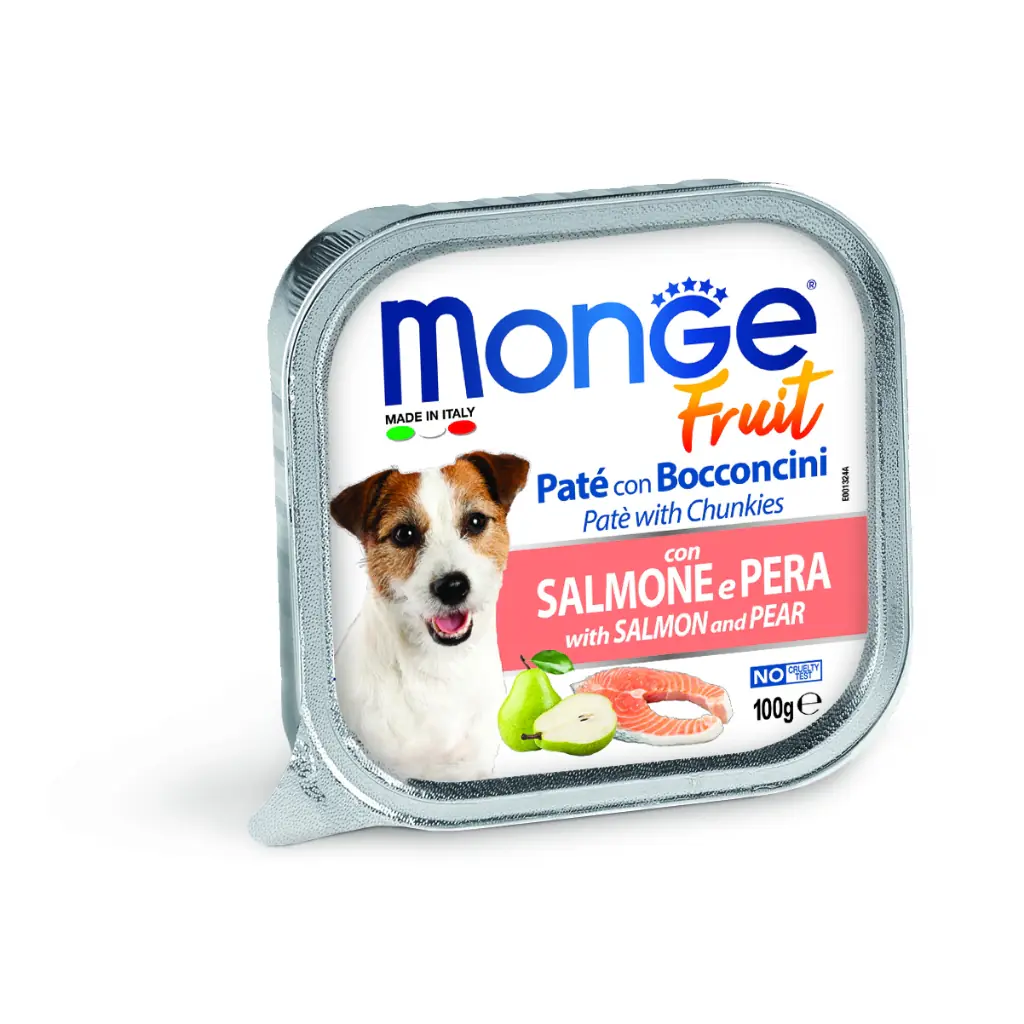 Complete and digestible food studied for the balanced diet of adult dogs. Soft and tasty paté and chunkies with salmon and pear, it has a firm texture and a pleasant aroma. Delicious paté with a centre of delectable chunks with meat and fruit to give your four-legged friends the daily well-being they need. Monge Fruit is free of colourants and preservatives.