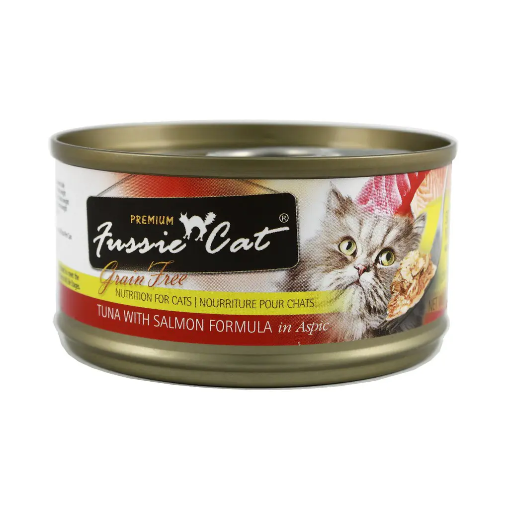 Fussie Cat Premium Tuna with Salmon in Aspic Grain-Free Canned Cat Food features tuna as the primary ingredient, offering a rich source of protein and omega-3 fatty acids that promote healthy skin and a shiny coat.